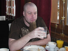 Olen herännyt joka aamu viimeistään seitsemältä, mitä pidän melko kummallisena. Aamupalakin alkaa vasta kahdeksalta. Seiniin on siis tuijoteltu, kun ei viitsi hirveästi alkaa mesoamaankaan ja herättää muita. Kahvi on paskaa, muuten on hyvää sapuskaa. Oluessa ei myöskään ole valittamista, kiitokset tällekin ravintolalle mahdollisimman pienestä hinta-laatusuhteesta (=0, viisastelua jälleen, ho-ho-ho!). Sunnuntaina tehtiin soundit kuntoon lopullisesti. Tuottamamme metelin on jostain syystä sanottu kuulostavan laadukkaalta. Ehkä se soundi sitten lähtee sormista. Mannapuuroa sisään, mansikoita ulos vai mitä Simo?