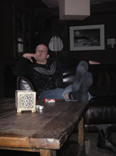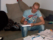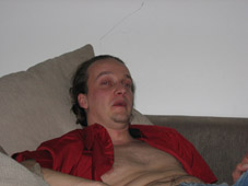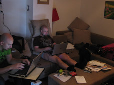 Yllättävän rauhaisissa merkeissä on myös yhteiselomme täällä sujunut lukuunottamatta toisen illan kahden alastoman miehen neljän tunnin kännikinaa. Kauhuskenaario oli, että naamat alkavat v***ttaa siinä määrin, että saadaan pistää bändi telakalle reissun jälkeen. Kuvitelkaa itse: 5 valloittavaa "persoonaa", 10 päivää, 24 tuntia, 20 neliötä, kaikkien kamat sikin sokin, hikisiä sukkia, paskaisia kalsareita, puolityhjiä tuoppeja, epämääräisiä A4:sia... Ahdistuksen olisi voinut kuvitella iskevän tähän mennessä. En tiedä, mikä on porukan rauhoittanut, mutta hyvä kun on.